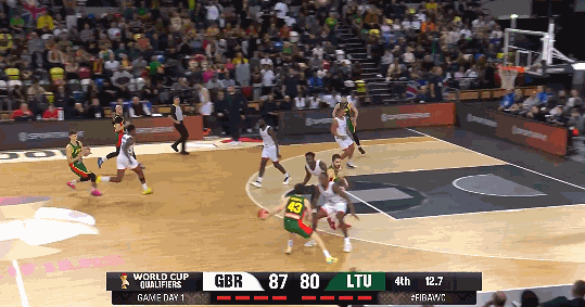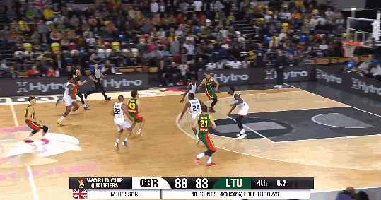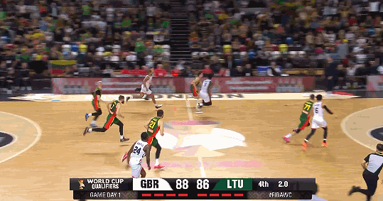随后英国队球员迈尔斯-赫森罚中1分,将分差扩大至88-83。关键时刻,萨吉乌纳斯在还剩3.5秒时命中一记高难度三分,将比分追至88-86。